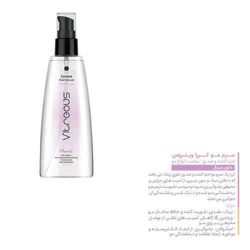 سرم مو کررا ویتروس یک سرم مو احیا کننده و ضد وز حاوی زینک میباشد که با بافتی سبک و بدون چربی، از آسیب های حرارتی و محیطی جلوگیری نموده و موجب تقویت، ترمیم و درخشندگی مو شده و از نازک شدن و شکنندگی آن جلوگیری مینماید.