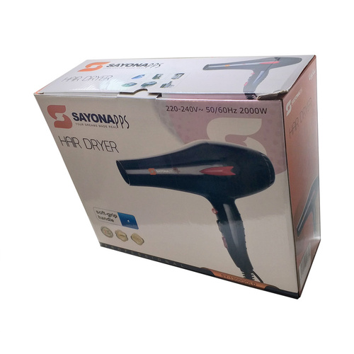سایونا برند نام آشنا در تولید محصولات با کیفیت برقی است.یکی از این محصولات با کیفیت سشوار سایونا 2000 وات مدل SY-1300 است. این محصول با بهره گیری از موتور AC دارای قدرت پرتاب باد بسیار بالایی است و در دسته سشوار های حرفه ای قرار میگیرد.روی دسته این محصول 3 دکمه تعبیه شده که آنها تنظیم حرارت سشوار و سرعت دمیدن باد را به عهده دارند به این صورت که یک دکمه جهت ایجاد باد سرد به طور لحظه ای است. یک دکمه 3 حالت بدون حرارت، حرارت کم و حرارت زیاد را انجام میدهد. یک دکمه هم تنظیم 3 حالت باد خاموش، سرعت کم و سرعت زیاد را به عهده دارد.همچنین درون بسته بندی سری متمرکز کننده وجود دارد.